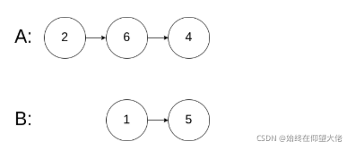 解释:从各自的表头开始算起,链表 A 为 [2,6,4],链表 B 为 [1,5]。