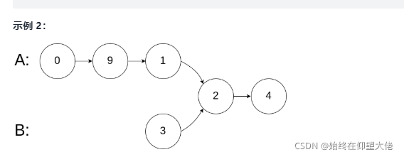 从各自的表头开始算起,链表 A 为 [0,9,1,2,4],链表 B 为 [3,2,4]。