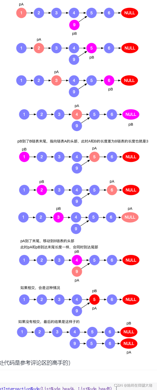 最直接的说法:若相交,链表A: a+c, 链表B : b+c. a+c+b+c = b+c+a+c 。则会在公共处c起点相遇。若不相交,a +b = b+a 。因此相遇处是NULL。